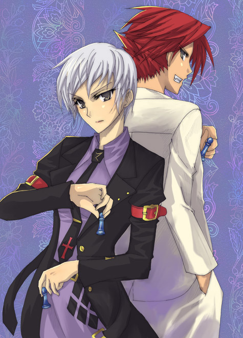 00s board_game chess grey_eyes isya red_hair umineko_no_naku_koro_ni ushiromiya_battler ushiromiya_kyrie white_hair