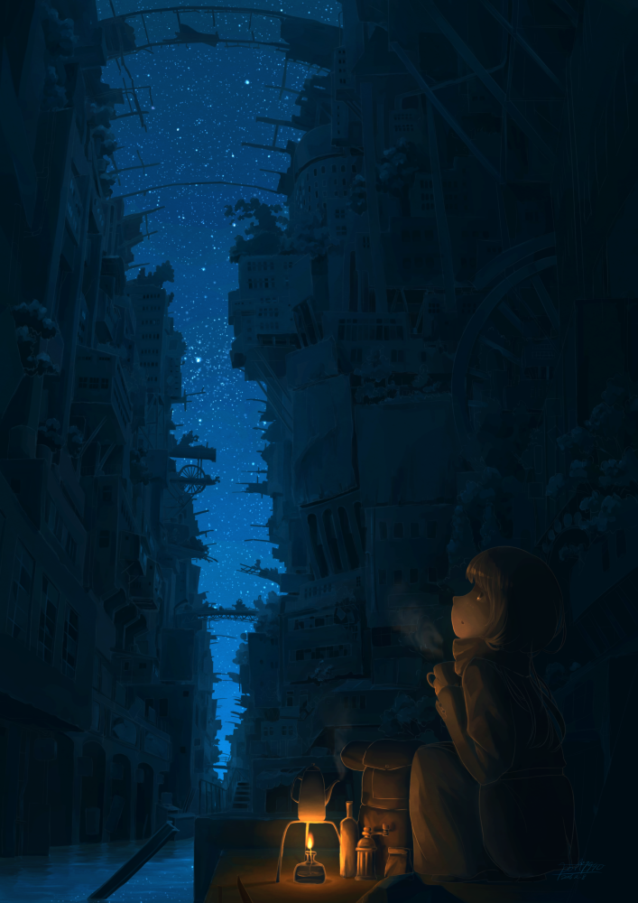 1girl artist_name backpack bag bottle camping city cup dark dated female_focus fire kettle long_hair looking_up night original outdoors overgrown pepper_shaker pochi_(poti1990) profile river ruins satchel scarf scenery signature sky solo squatting star_(sky) starry_sky steam teacup tree vanishing_point water