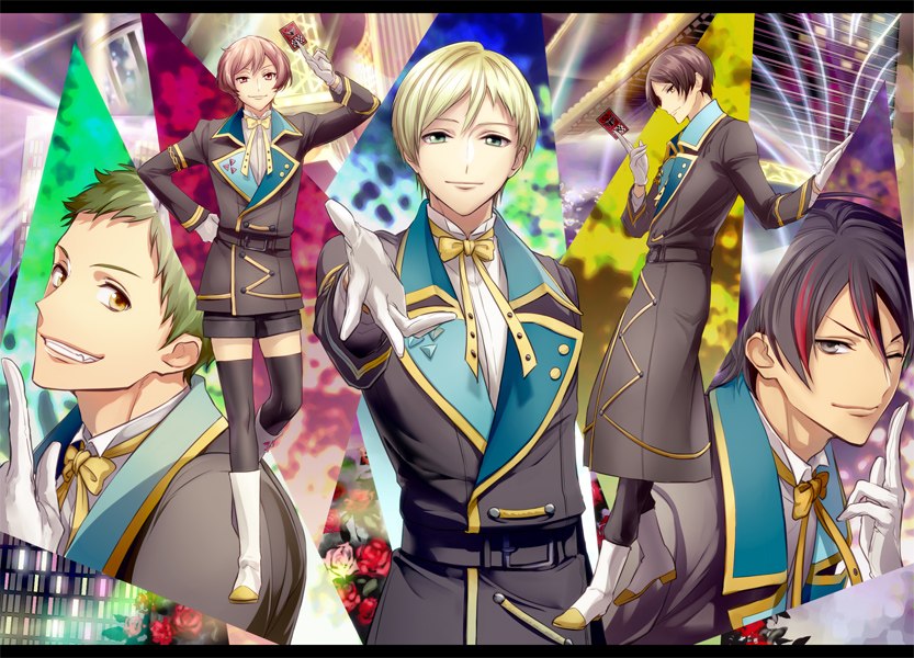 10s 5boys black_hair black_legwear blonde_hair boots brown_eyes card coat fang gloves green_hair grey_eyes grin inumine_seishirou joka_(night_gate) male_focus multicolored_hair multiple_boys one_eye_closed pink_eyes pink_hair red_hair ribbon sawatari_eigo shorts smile starmyu tatsumi_rui team_hiiragi thighhighs toraishi_izumi ugawa_akira white_gloves