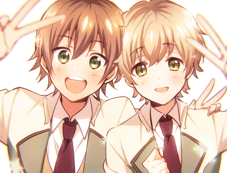 10s 2boys bad_id bad_pixiv_id blonde_hair blush brown_hair green_eyes hoshitani_yuuta male_focus multiple_boys nayuki_tooru necktie open_mouth school_uniform short_hair smile star_(symbol) starmyu tsuchiya_(1315444) v yellow_eyes