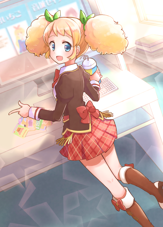 10s 1girl aikatsu! aikatsu!_(series) black_boots blonde_hair blue_eyes blush boots bow brown_boots cup drink drinking_straw dutch_angle female_focus from_behind hair_bow knee_boots long_hair looking_at_viewer looking_back monitor open_mouth plaid_clothes plaid_skirt quro_(black_river) red_bow saegusa_kii skirt smile solo twintails