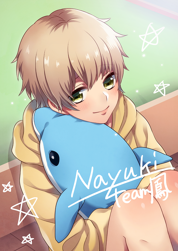 10s 1boy an_hajime blonde_hair blush character_name hood hoodie male_focus nayuki_tooru short_hair smile solo starmyu stuffed_animal stuffed_dolphin stuffed_toy yellow_eyes