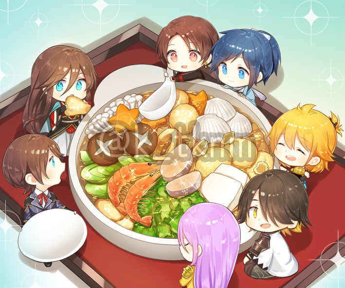 10s 6+boys ^_^ black_hair blue_eyes bowl brown_hair chibi closed_eyes food food_focus hachisuka_kotetsu hair_over_one_eye horikawa_kunihiro hotpot izumi-no-kami_kanesada japanese_clothes k_(shinya90) kashuu_kiyomitsu male_focus mini_person miniboy mole mole_under_eye mole_under_mouth multiple_boys nabe nagasone_kotetsu open_mouth orange_hair plate ponytail purple_hair red_eyes scarf shrimp smile spoon touken_ranbu tray urashima_kotetsu watermark yamato-no-kami_yasusada yellow_eyes