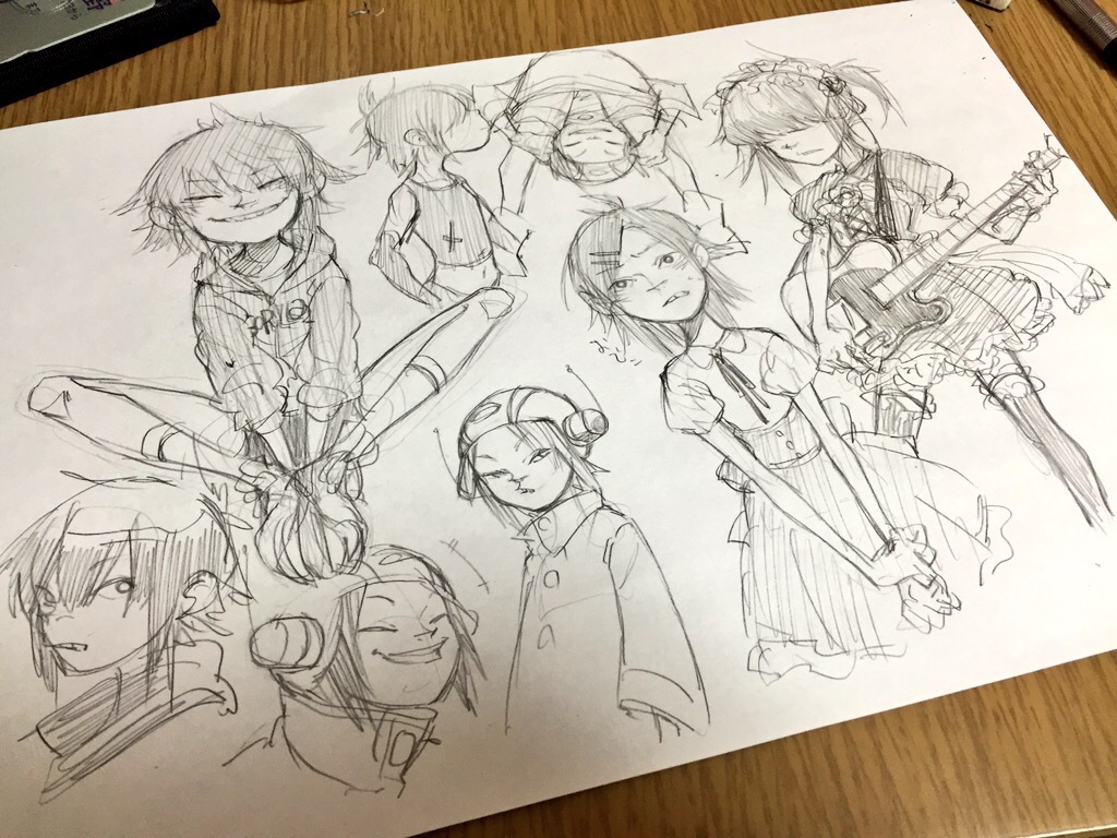 1girl drawing dress food gorillaz gothic_lolita happy headdress helmet lolita_fashion multiple_persona noodle_(gorillaz) noodles photo_(medium) short_hair sketch smile
