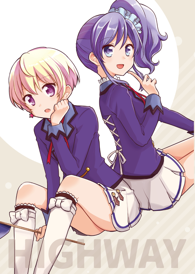 10s 2girls aikatsu! aikatsu!_(series) blonde_hair blue_eyes blue_hair blush hair_ribbon hattori_yu kiriya_aoi looking_at_viewer multiple_girls purple_eyes quro_(black_river) ribbon short_hair side_ponytail skirt smile
