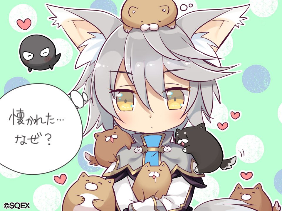 >_< 1girl animal animal_ears animal_on_head animal_on_shoulder blush closed_eyes dog eco_(petticoat) female_focus heart holding holding_animal multiple_dogs official_art on_head pop-up_story rita_drake short_hair silver_hair solo speech_bubble tail thought_bubble too_many too_many_dogs wolf_ears wolf_tail yellow_eyes