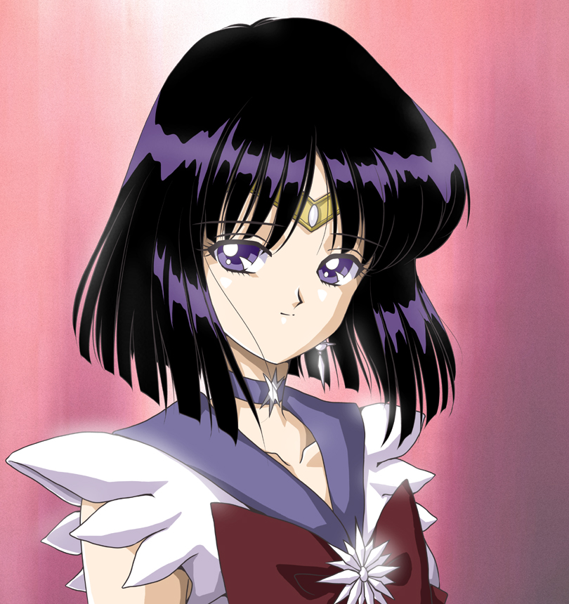 1girl bishoujo_senshi_sailor_moon black_hair bow brooch brown_bow choker close-up earrings female_focus hino_ryutaro jewelry looking_at_viewer magical_girl pink_background purple_eyes sailor_collar sailor_saturn short_hair smile solo star_brooch tiara tomoe_hotaru upper_body