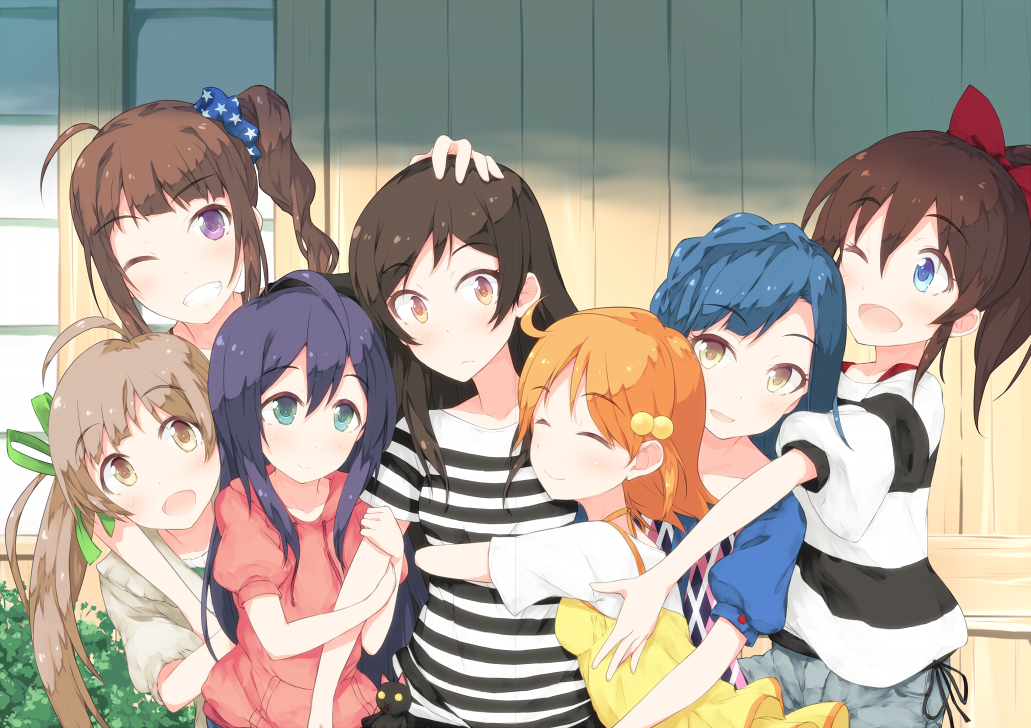 10s 6+girls ahoge asterisk_(asterism) blue_eyes blue_hair brown_eyes brown_hair group_hug hakozaki_serika hug idolmaster idolmaster_(classic) idolmaster_million_live! idolmaster_movie kitazawa_shiho long_hair looking_at_another mochizuki_anna multiple_girls nanao_yuriko open_mouth ponytail satake_minako short_hair side_ponytail smile twintails upper_body yabuki_kana yellow_eyes yokoyama_nao
