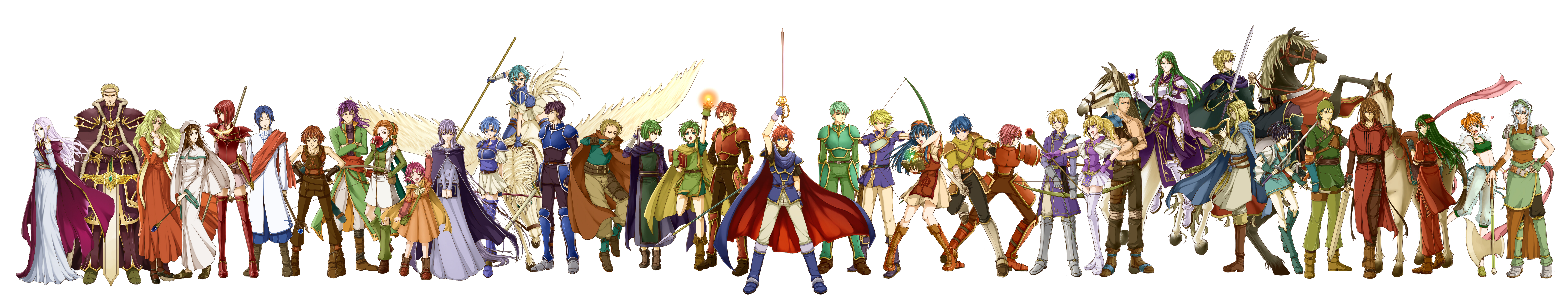 >:o 6+boys 6+girls :o ;d ^_^ absurdres alen_(fire_emblem) annotated aqua_hair arm_up armor axe bandana bare_shoulders beard belly_chain blonde_hair blue_dress blue_hair book boots bow_(weapon) breastplate brown_eyes brown_hair cape cath_(fire_emblem) cecilia_(fire_emblem) chad_(fire_emblem) clarine_(fire_emblem) cloak closed_eyes coat dagger delsaber dieck_(fire_emblem) dorothy_(fire_emblem) dress echidna_(fire_emblem) elbow_gloves elen_(fire_emblem) elffin_(fire_emblem) expressionless facial_hair facial_mark fae_(fire_emblem) fingerless_gloves fire fire_emblem fire_emblem:_the_binding_blade forehead_mark gauntlets gem gloves gold_trim green_eyes green_gloves green_hair guinevere_(fire_emblem) gwendolyn_(fire_emblem) heterochromia highres holding holding_book horse horseback_riding huge_weapon hugh_(fire_emblem) idunn_(fire_emblem) jewelry klein_(fire_emblem) knife lance_(fire_emblem) larum_(fire_emblem) light_purple_hair lilina_(fire_emblem) long_image long_sleeves looking_back lugh_(fire_emblem) magic melady_(fire_emblem) midriff multiple_boys multiple_girls nintendo noah_(fire_emblem) ogier_(fire_emblem) one_eye_closed open_mouth pegasus perceval_(fire_emblem) pink_hair pointy_ears polearm purple_eyes purple_hair raigh_(fire_emblem) red_dress red_hair riding robe roy_(fire_emblem) rutger_(fire_emblem) saul_(fire_emblem) shanna_(fire_emblem) shoes short_sleeves simple_background sin_(fire_emblem) skirt sleeveless smile sophia_(fire_emblem) spear staff sue_(fire_emblem) sword thea_(fire_emblem) thigh_boots thighhighs topless_male v-shaped_eyebrows weapon white_background wide_image wolt_(fire_emblem) zephiel_(fire_emblem) zettai_ryouiki
