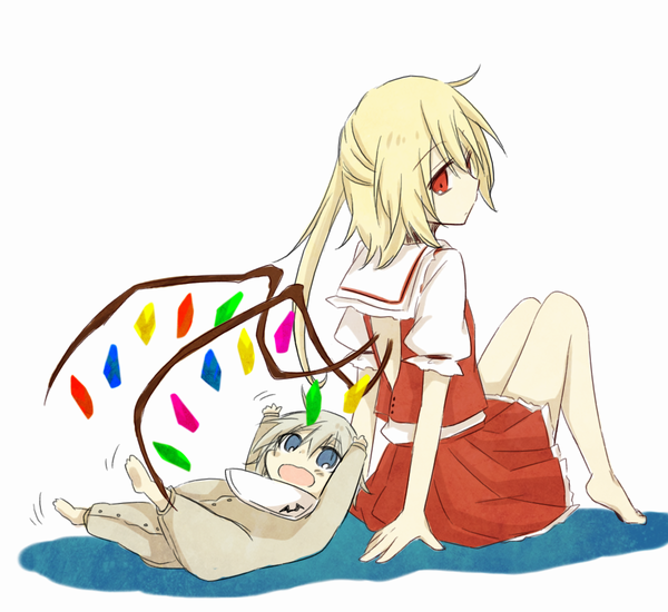2girls aged_down blonde_hair blue_eyes child flandre_scarlet izayoi_sakuya looking_back lying multiple_girls mundane_utility missing_headwear on_back open_mouth playing puffy_short_sleeves puffy_sleeves red_eyes shirt short_sleeves silver_hair simple_background sitting skirt skirt_set smile touhou vest white_background wings wrist_cuffs yuuta_(monochrome)