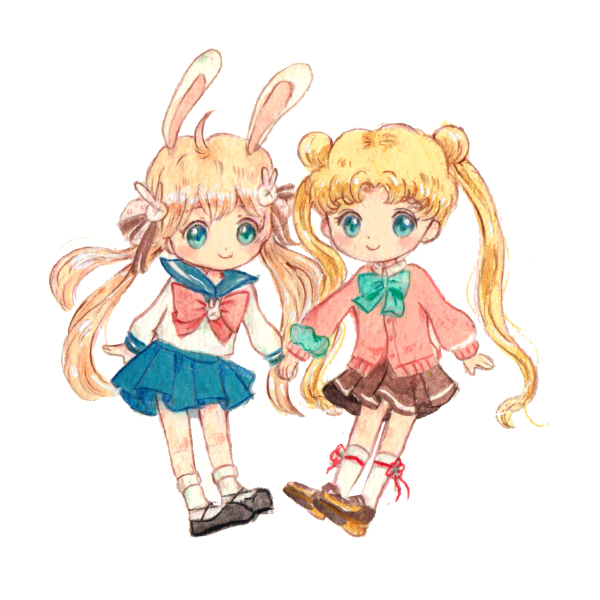 2girls animal_ears bishoujo_senshi_sailor_moon blonde_hair blue_sailor_collar rabbit_hair_ornament carrie_luk cosplay costume_switch crossover double_bun dual_persona female_focus green_eyes hair_bun hair_ornament holding_hands long_hair look-alike multiple_girls pleated_skirt rabbit_ears sailor_collar sailor_moon school_uniform serafuku shironeko_project simple_background skirt smile sweater trait_connection tsukimi_(shironeko_proect)_(cosplay) tsukimi_(shironeko_project) tsukimi_(shironeko_project)_(cosplay) tsukino_usagi tsukino_usagi_(cosplay) twintails very_long_hair white_background