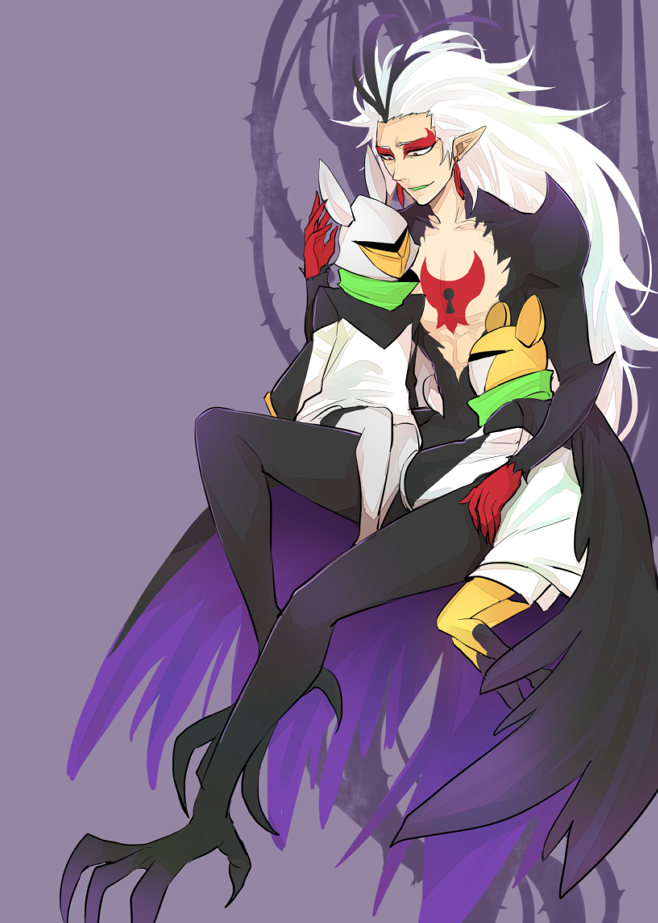 1boy black_bodysuit black_hair black_wings bodysuit close_(precure) earrings eyeshadow freeze_(precure) go!_princess_precure helmet jewelry kei_(keikh1) long_hair makeup multicolored_hair pointy_ears precure purple_background sitting sitting_on_lap sitting_on_person smile spoilers stop_(precure) streaked_hair two-tone_hair white_hair wings