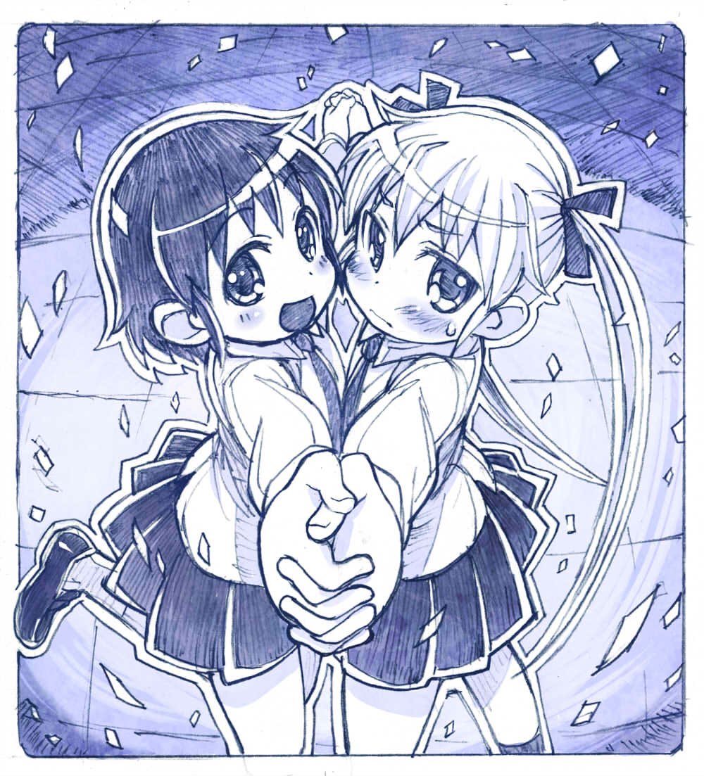 2girls :d blue_theme blush dress_shirt foreshortening from_side hair_ribbon holding_hands interlocked_fingers kill_me_baby leg_up loafers long_hair long_sleeves looking_at_viewer monochrome multiple_girls necktie open_mouth oribe_yasuna outline outstretched_arms pleated_skirt ribbon sakino_shingetsu school_uniform shirt shoes short_hair skirt smile socks sonya_(kill_me_baby) spread_arms sweatdrop tareme traditional_media tsurime twintails