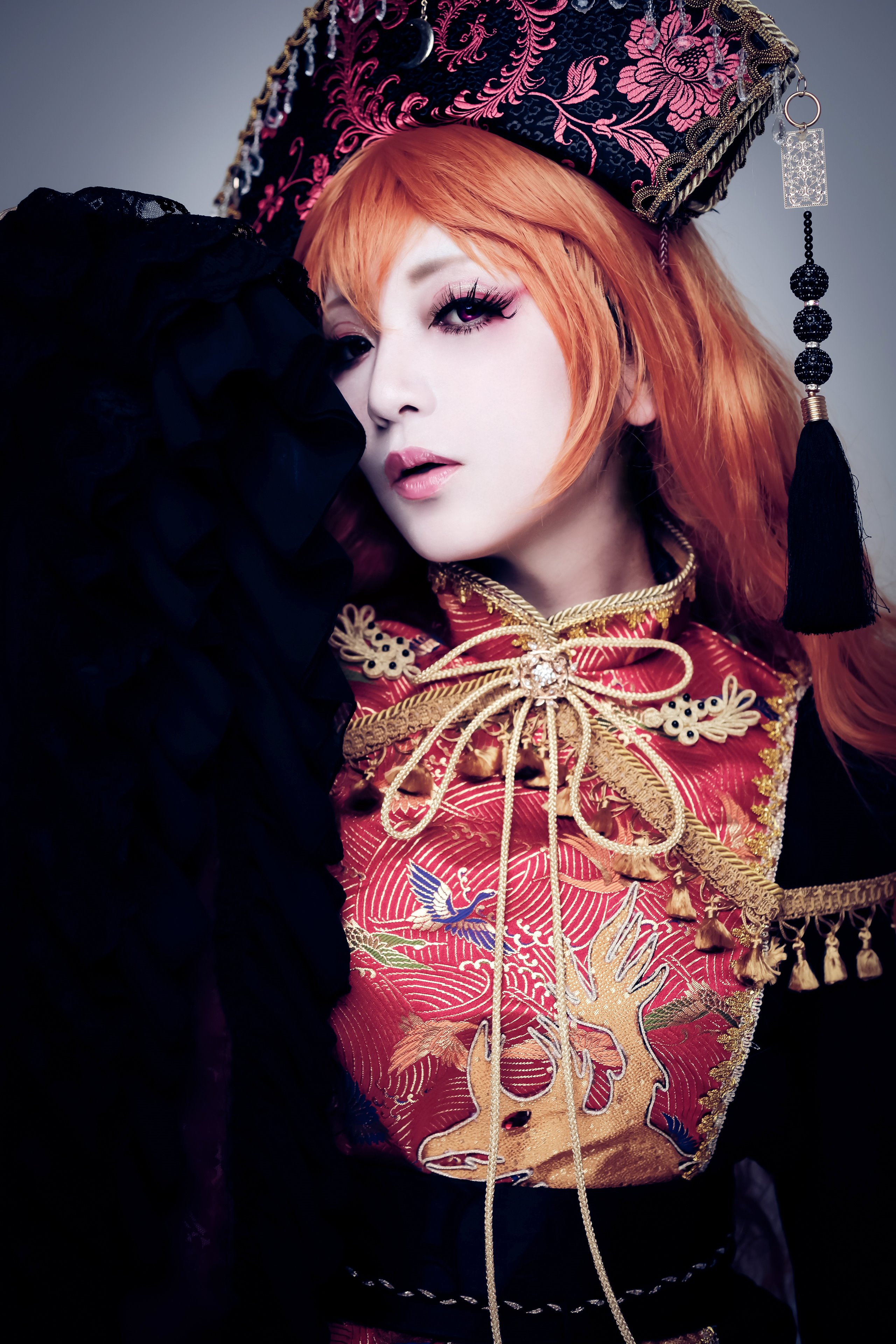 1girl absurdres asian bad_id bad_twitter_id chinese_clothes cosplay cosplay_photo embellished_costume female_focus gradient_background hat highres inactive_account junko_(touhou) junko_(touhou)_(cosplay) lips long_hair long_sleeves looking_at_viewer makeup orange_hair photo-referenced photo_(medium) red_eyes reference_photo reference_work sleeves_past_wrists solo soubi_(cosplayer) tabard touhou upper_body wide_sleeves