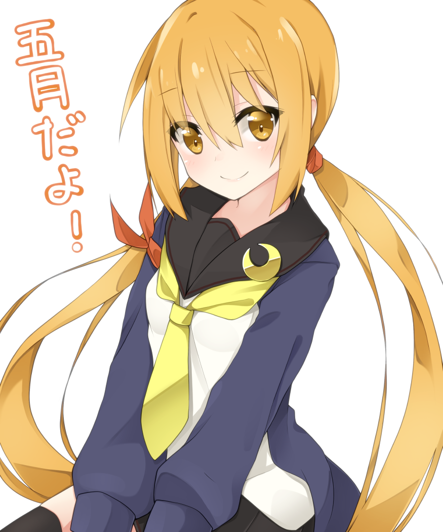 10s 1girl armband bad_id black_skirt black_thighhighs blonde_hair blue_jacket blush closed_mouth crescent crescent_pin eyebrows female_focus hair_between_eyes head_tilt jacket kantai_collection long_hair long_sleeves looking_at_viewer low_twintails neckerchief open_clothes open_jacket pleated_skirt rateratte red_ribbon ribbon sailor_collar satsuki_(kancolle) satsuki_kai_ni_(kancolle) shirt simple_background sitting skirt solo text_focus thighhighs translation_request twintails v_arms very_long_hair white_background white_shirt yellow_eyes yellow_neckerchief zettai_ryouiki