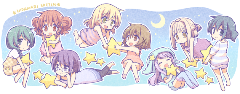 6+girls braid brown_eyes brown_hair chibi closed_eyes closed_mouth crescent_moon glasses hair_ornament hidamari_sketch hiro_(hidamari_sketch) matsuri_(hidamari_sketch) miyako_(hidamari_sketch) moon multiple_girls natsume_(hidamari_sketch) nazuna_(hidamari_sketch) night nori_(hidamari_sketch) open_mouth pajamas quro_(black_river) sae_(hidamari_sketch) short_hair star_(symbol) x_hair_ornament yuno_(hidamari_sketch)