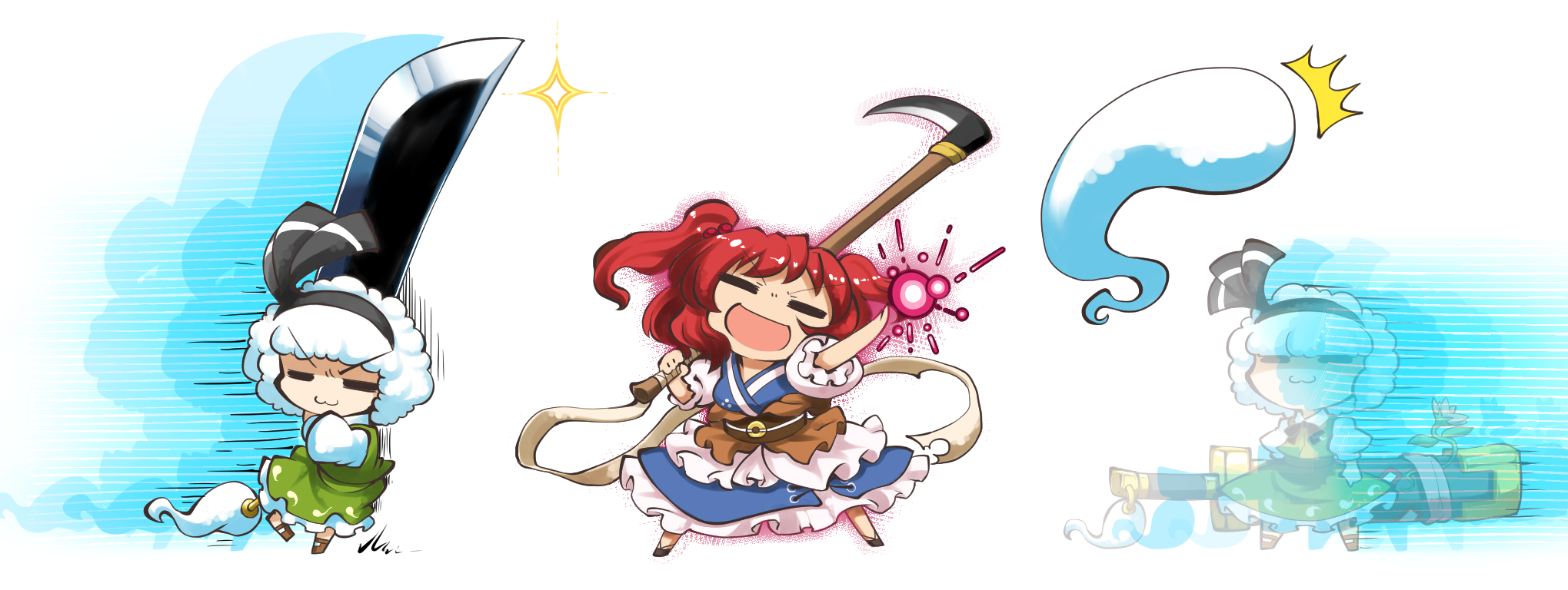 >:3 2girls :3 =_= ^^^ afro afterimage alternate_hairstyle blue_dress dress energy green_skirt green_vest hairband highres holding holding_sword holding_weapon kashuu_(b-q) konpaku_youmu konpaku_youmu_(ghost) legs_apart motion_lines multiple_girls obi onozuka_komachi open_mouth red_hair sash scythe sheath sheathed shirt short_hair short_sleeves simple_background skirt skirt_set smile surprised sword touhou two_side_up unsheathed v-shaped_eyebrows vest weapon white_background white_hair white_shirt wide_stance