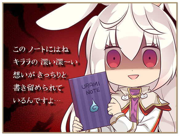 1girl animal_ears book crazy_eyes death_note eco_(petticoat) female_focus gradient_background kirara_ookami long_hair official_art parody pop-up_story rabbit_ears rabbit_girl red_eyes shaded_face smile solo upper_body white_hair