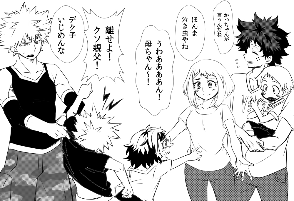 10s 2girls 4boys aged_up bad_id bad_pixiv_id bakugou_katsuki blush_stickers boku_no_hero_academia comic freckles greyscale husband_and_wife if_they_mated izuocha midoriya_izuku momonga momonga_(ooiaura) monochrome multiple_boys multiple_girls shirt short_hair sidelocks smile speech_bubble tank_top translation_request uraraka_ochako