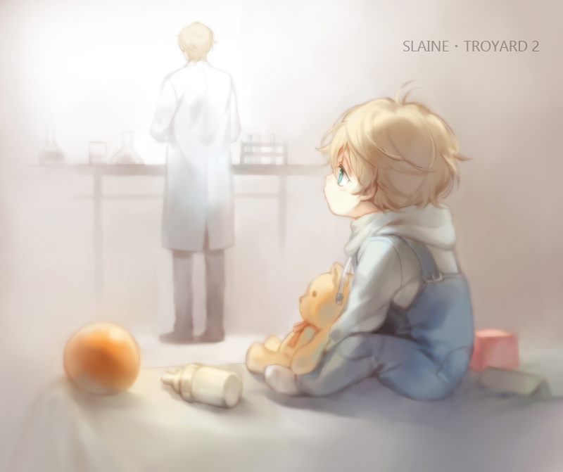 10s 2boys aged_down aldnoah.zero aqua_eyes baby_bottle ball beaker block_(object) blonde_hair bottle child facing_away father_and_child father_and_son holding holding_stuffed_toy kanmuri_(hanyifan30338) lab_coat multiple_boys overalls parent_and_child short_hair sitting slaine_troyard socks stuffed_animal stuffed_toy teddy_bear test_tube white_legwear