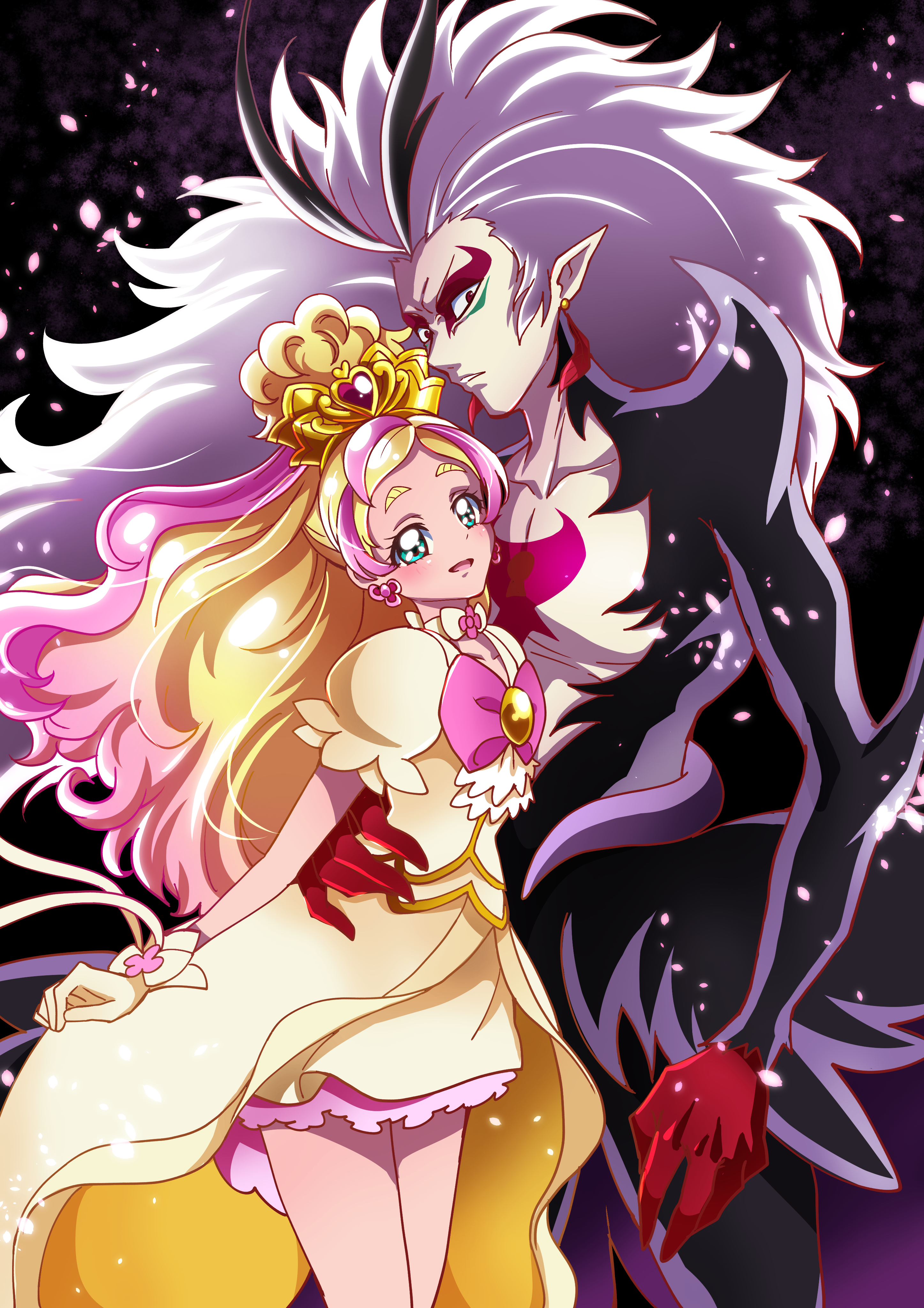 1boy 1girl absurdres bad_id bad_pixiv_id black_bodysuit black_hair blonde_hair bodysuit bow close_(precure) cowboy_shot cure_flora cure_flora_(grand_princess) earrings eyeshadow flower_earrings gloves go!_princess_precure grand_princess_(go!_princess_precure) green_eyes grey_hair haruno_haruka highres jewelry long_hair looking_at_viewer magical_girl makeup multicolored_hair pale_skin pink_bow pink_hair pointy_ears precure puffy_sleeves red_eyes red_gloves sharumon skirt smile spoilers streaked_hair thick_eyebrows two-tone_hair yellow_gloves yellow_skirt