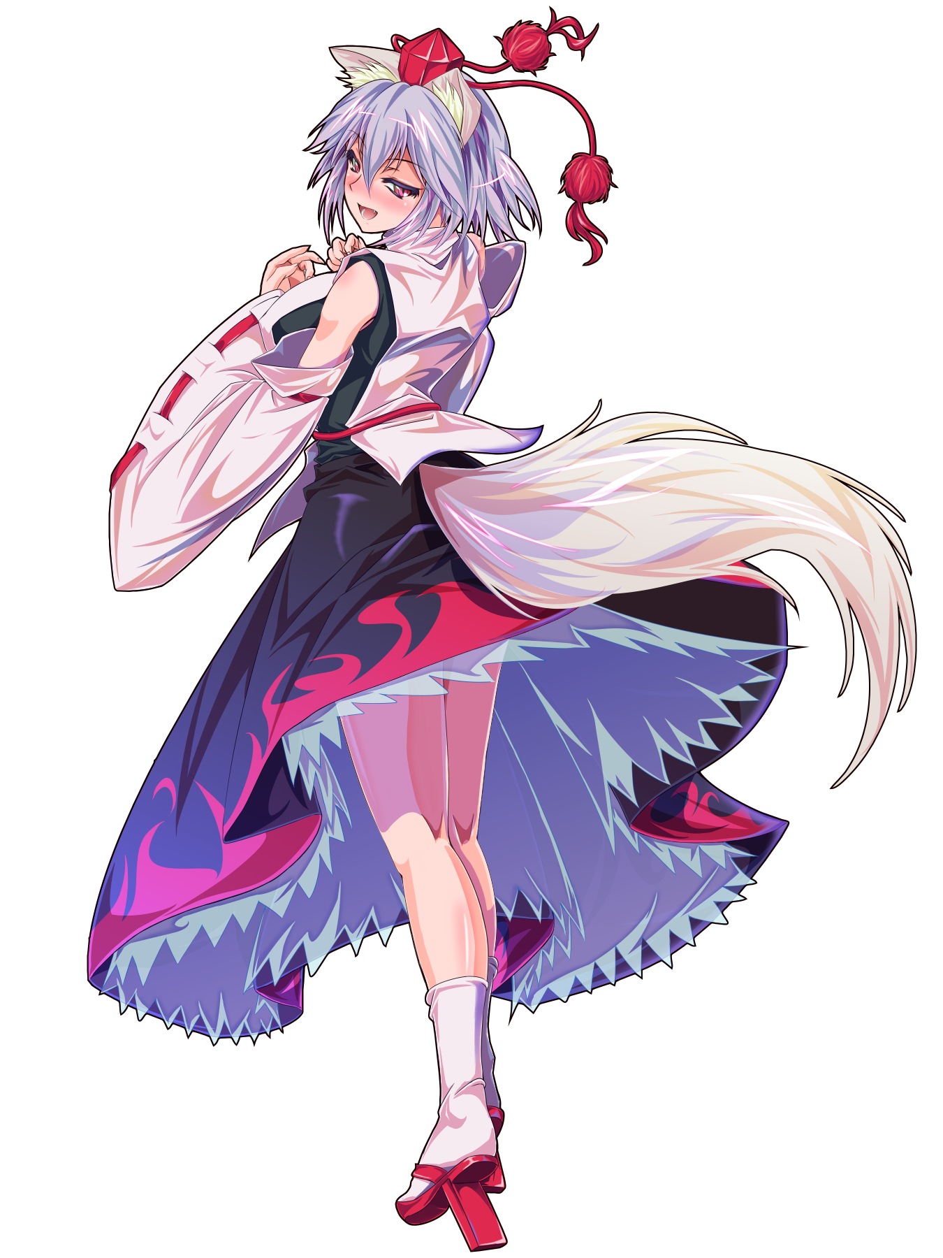 >:d 1girl :d animal_ears bare_shoulders black_skirt blush detached_sleeves fang female_focus full_body geta hat highres inubashiri_momiji japanese_clothes kneepits long_sleeves looking_at_viewer looking_back nose_blush open_mouth pom_pom_(clothes) red_eyes ribbon-trimmed_sleeves ribbon_trim short_hair silver_hair skirt smile socks solo tachi-e tail tengu-geta tokin_hat touhou transparent_background v-shaped_eyebrows white_background white_socks wide_sleeves wolf_ears wolf_tail zephid