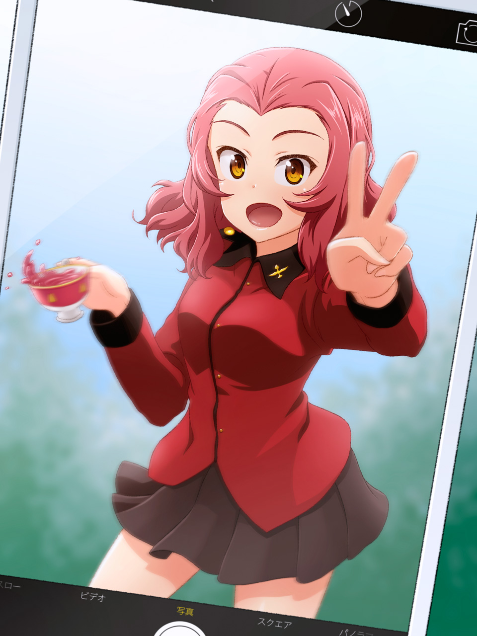 10s 1girl brown_eyes camera_phone cellphone drink fake_phone_screenshot fake_screenshot female_focus girls_und_panzer highres miniskirt open_mouth phone red_hair rosehip_(girls_und_panzer) school_uniform skirt smartphone solo taking_picture tea unyon v
