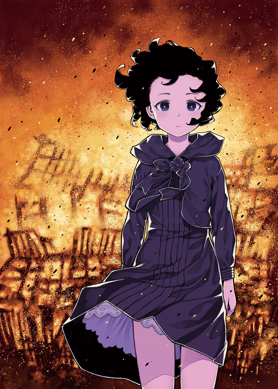1girl aged_down backlighting black_dress black_eyes black_hair bright_pupils burning cowboy_shot dress expressionless female_focus fire hamada_yoshikazu highres kagami_kanaka long_sleeves official_art scene_reference short_hair solo standing tsugumomo wind
