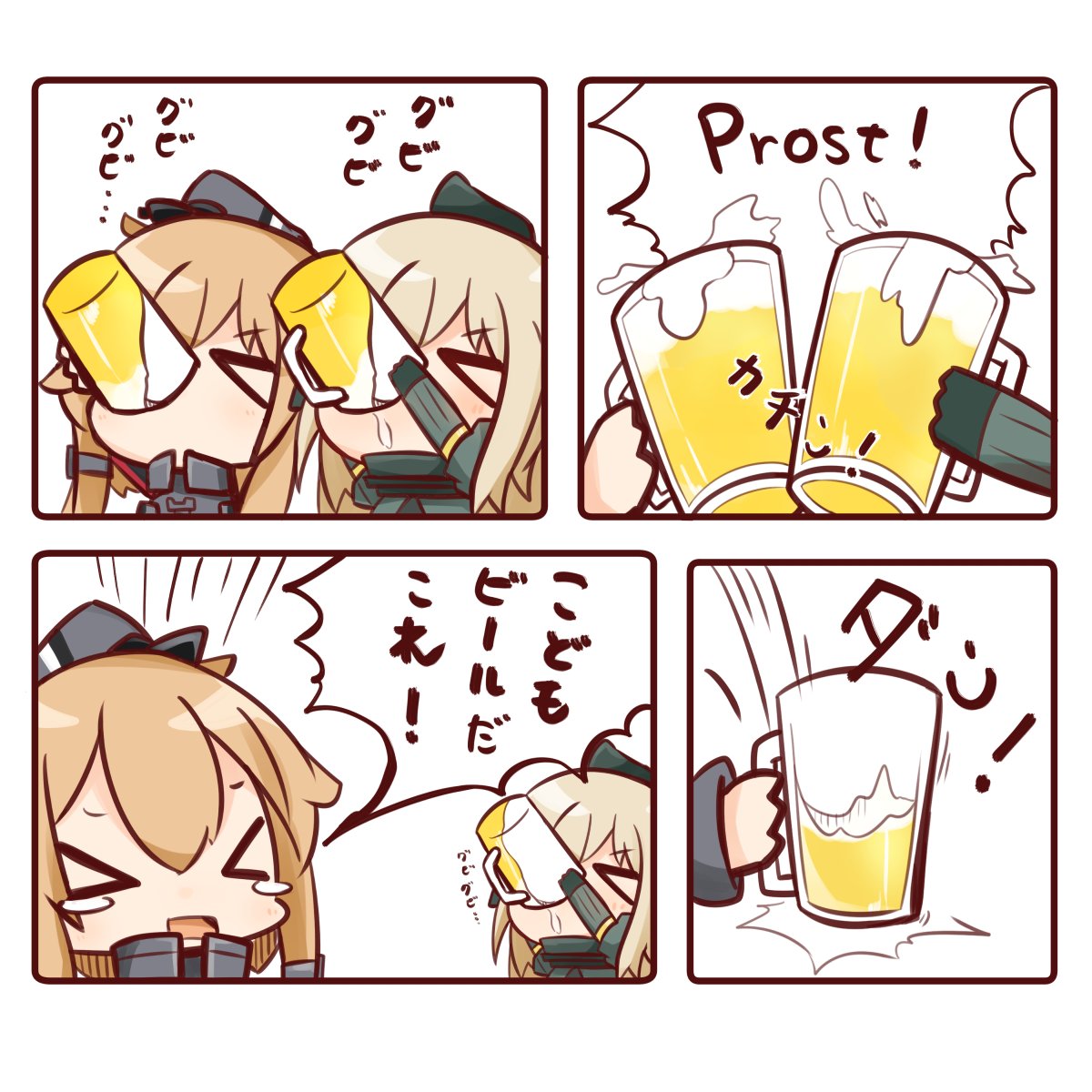 >_< 10s 2girls alcohol bad_id bad_twitter_id beer beer_mug chibi closed_eyes comic commentary_request cup female_focus garrison_cap german_text hat highres kantai_collection long_hair military military_uniform mug multiple_girls nuu_(nu-nyu) open_mouth peaked_cap prinz_eugen_(kancolle) simple_background speech_bubble tears translation_request u-511_(kancolle) white_background