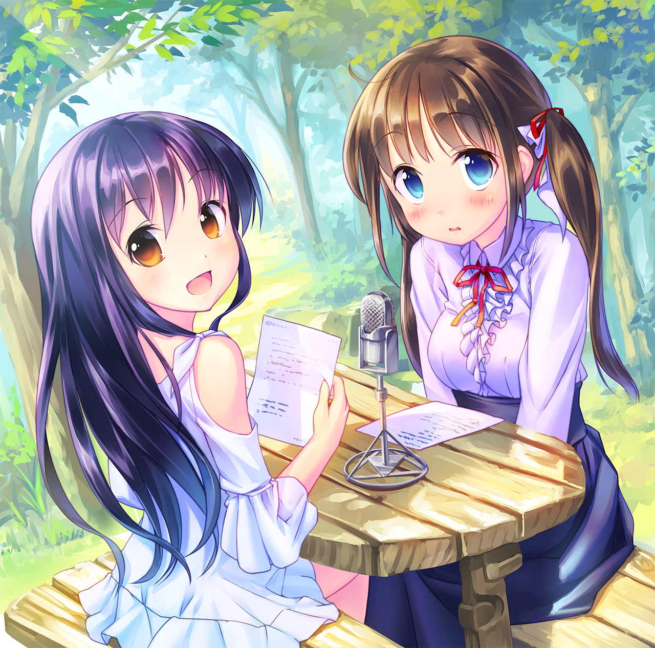 2girls :d bad_id bad_pixiv_id bare_shoulders blue_eyes blush brown_eyes brown_hair center_frills day dress frills hair_ribbon highres long_hair long_sleeves looking_at_viewer microphone multiple_girls nature open_mouth original outdoors purple_hair ribbon sitting skirt smile table takoyaki_(roast) tree twintails wavy_mouth