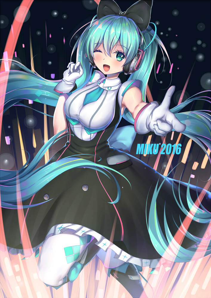 10s 1girl 2016 ;d aqua_hair bad_id bad_pixiv_id character_name dress female_focus finger_gun gloves green_eyes hatsune_miku headphones index_finger_raised long_hair magical_mirai_(vocaloid) magical_mirai_miku magical_mirai_miku_(2016) necktie one_eye_closed open_mouth pantyhose smile solo twintails very_long_hair vocaloid xiaosan_ye