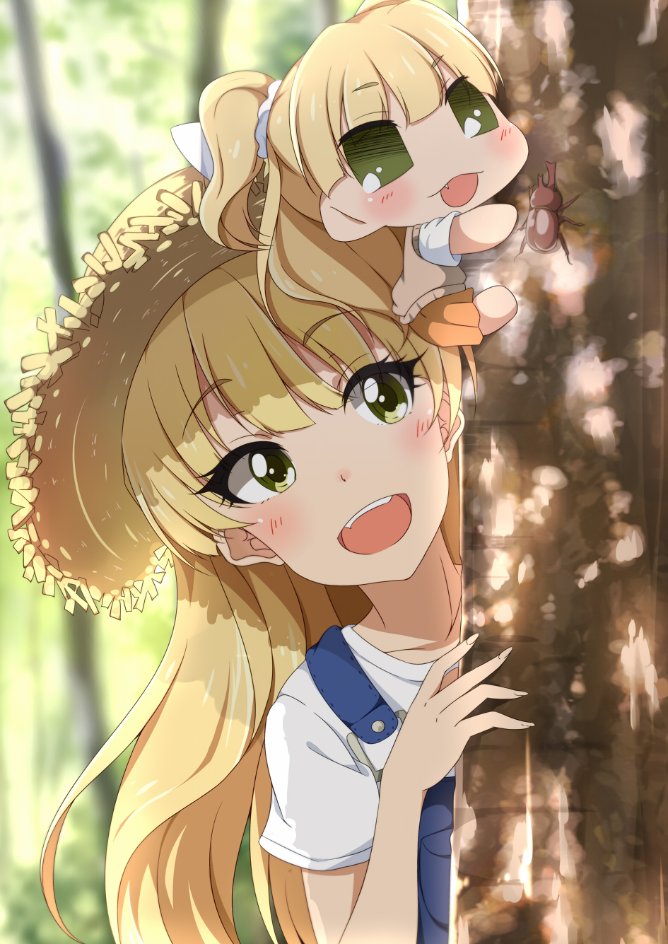 10s 1girl :d blonde_hair blush bug eyebrows green_eyes hat highres hitotsuki_nanoka idolmaster idolmaster_cinderella_girls jougasaki_rika long_hair open_mouth puchimasu! smile straw_hat tree