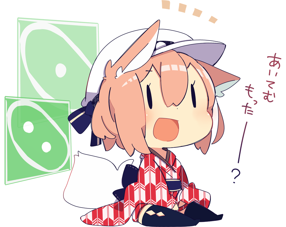 1girl animal_ears blonde_hair chibi commentary_request female_focus fox_ears fox_tail hair_between_eyes hat japanese_clothes kimono military_hat multiple_tails open_mouth original peaked_cap pekeko_(pepekekeko) phantasy_star phantasy_star_online_2 shima_(pepekekeko) short_kimono sitting solo tail thighhighs translation_request white_background wide_sleeves yagasuri