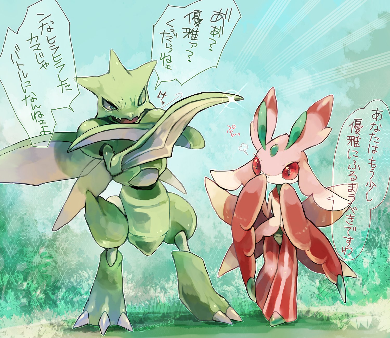 bad_id bad_twitter_id black_eyes bush colored_sclera emphasis_lines full_body gen_1_pokemon gen_7_pokemon glint green_eyes green_sclera height_difference highres kanami33 lurantis mismatched_sclera motion_lines nintendo no_humans open_mouth outdoors plant pokemon pokemon_(creature) praying_mantis red_sclera scyther speech_bubble standing talking text_focus translated
