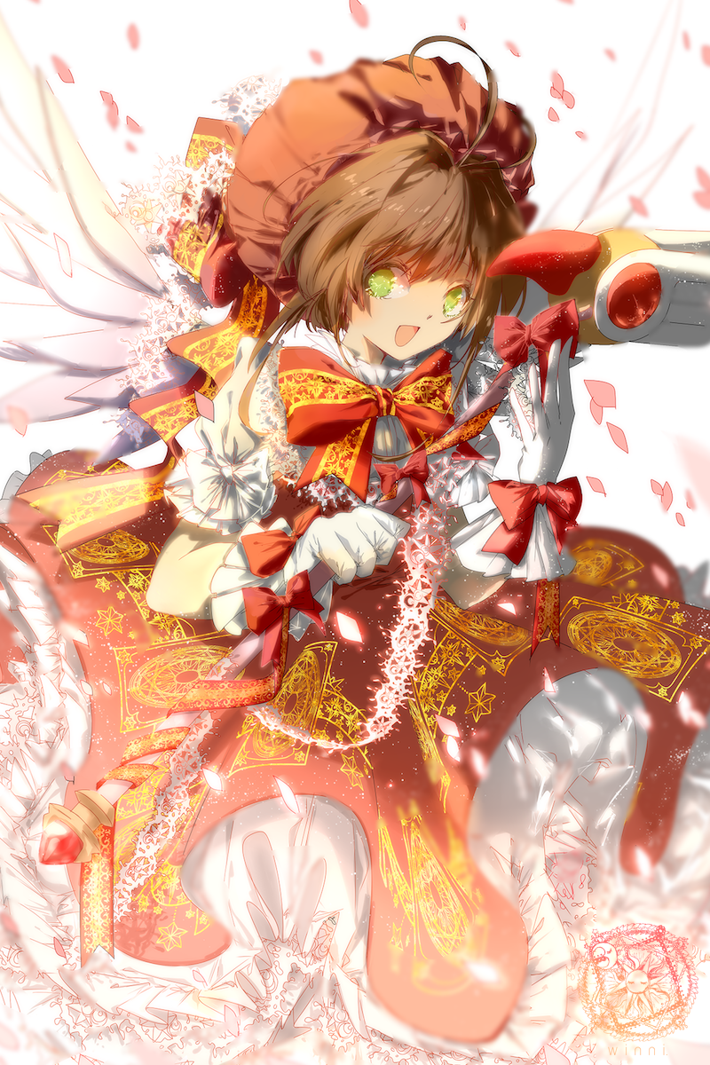 1990s_(style) 1girl :d ahoge artist_name blurry bow bowtie brown_hair cardcaptor_sakura clow_card depth_of_field dress embellished_costume female_focus fuuin_no_tsue gloves green_eyes hat highres holding kinomoto_sakura kinomoto_sakura_(magician) magic_circle open_mouth petals petticoat puffy_short_sleeves puffy_sleeves red_bow red_dress red_hat retro_artstyle ribbon-trimmed_gloves ribbon_trim short_hair_with_long_locks short_sleeves smile solo wand white_background white_bow white_gloves white_wings wings winni