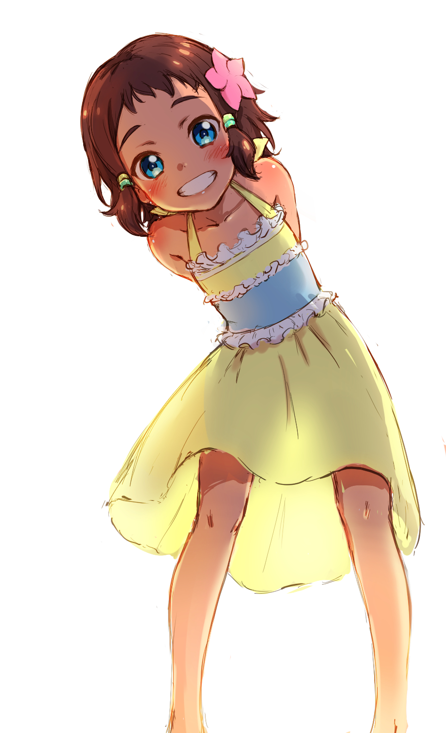 10s 1girl aikatsu! aikatsu!_(series) aikatsu_stars! arms_behind_back bare_shoulders blue_eyes blush collarbone commentary_request dress female_focus flower grin hair_flower hair_ornament highres jewelry leaning_forward looking_at_viewer maori_(aikatsu_stars) short_hair simple_background smile solo teeth wantacchi white_background yellow_dress