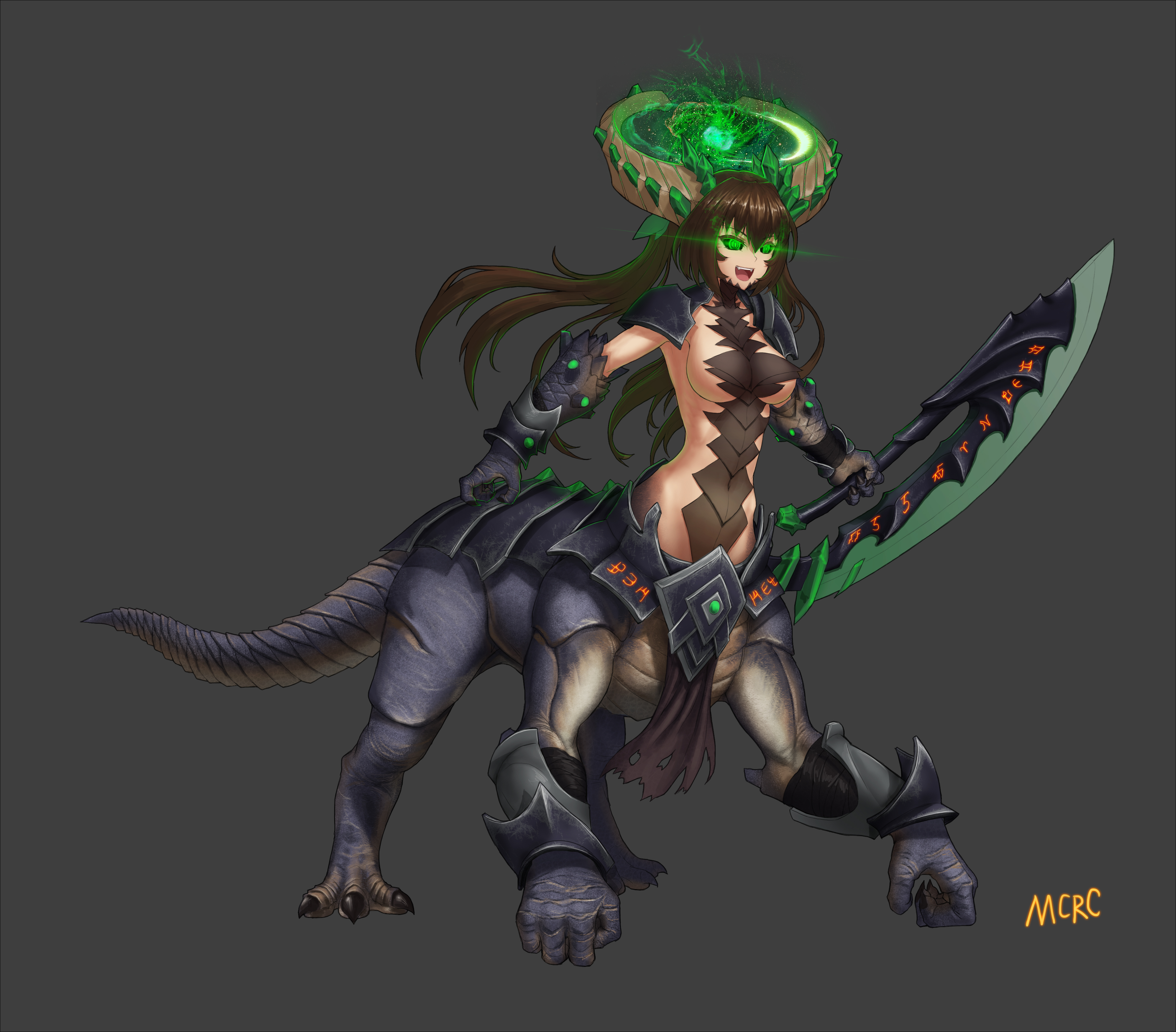 1girl :d absurdres artist_name black_sclera breasts brown_hair centauroid colored_sclera demon_girl dota_(series) dota_2 female_focus glowing glowing_eyes green_eyes highres horns mcrc_science monster_girl open_mouth runes smile solo sword taur twintails underlord_(dota) weapon