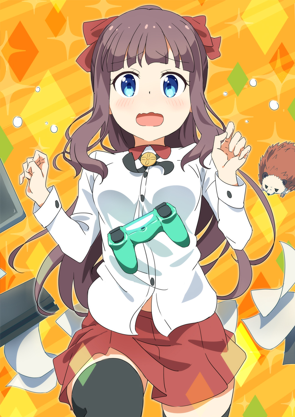 10s 1girl blue_eyes blush brown_hair controller female_focus flying_sweatdrops game_controller game_controller hair_ribbon hedgehog highres jitome long_hair looking_at_viewer new_game! open_mouth playstation_controller ponytail ribbon solo soujirou_(new_game!) squirrel takimoto_hifumi thighhighs tomato_(lsj44867) wavy_mouth