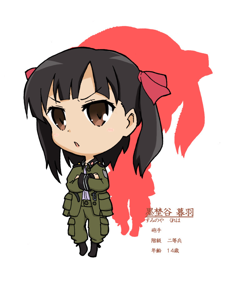 1girl brown_eyes brown_hair chibi colored_shadow female_focus military military_uniform nogikomugi shadow solo sonobashi_nogi sora_no_woto stats suminoya_kureha twintails