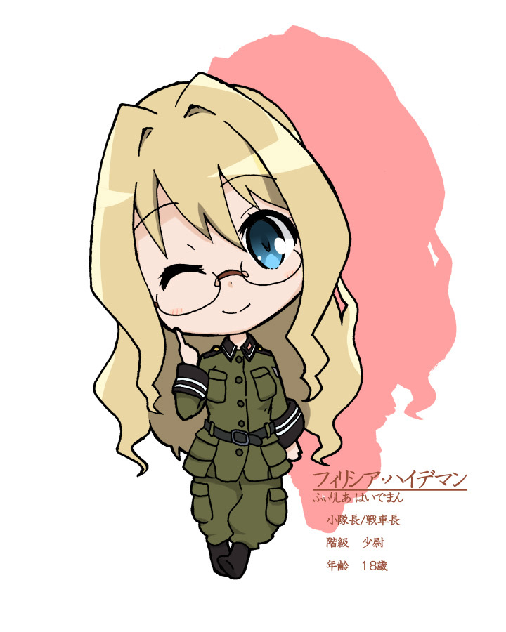 1girl blonde_hair blue_eyes chibi colored_shadow female_focus filicia_heideman glasses long_hair military military_uniform nogikomugi one_eye_closed shadow solo sonobashi_nogi sora_no_woto stats