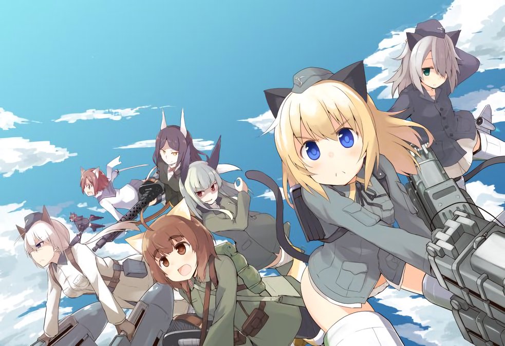 6+girls animal_ears artist_request blonde_hair blue_eyes brown_eyes character_request cloud cloudy_sky constantia_cantacuzino day green_eyes grete_m._gollob grey_hair hair_over_one_eye hanna_rudel head_wings helma_lennartz holding holding_weapon inufusa_yuno long_hair multiple_girls nishizawa_yoshiko open_mouth panties short_hair sky strike_witches strike_witches:_suomus_misfits_squadron tail third-party_source underwear weapon white_panties wings world_witches_series
