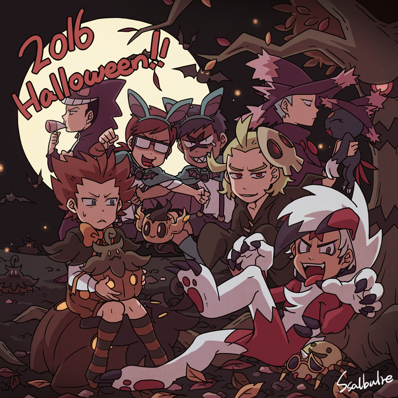 10s 2016 6+boys aged_down archie_(pokemon) archie_(pokemon_oras) black_hair blue_hair child claw_pose cosplay cyrus_(pokemon) duskull duskull_(cosplay) evil_grin evil_smile full_moon gen_1_pokemon gen_2_pokemon gen_3_pokemon gen_6_pokemon gen_7_pokemon gengar gengar_(cosplay) ghetsis_(pokemon) giovanni_(pokemon) glasses green_hair grin guzma_(pokemon) halloween happy_halloween leaf lycanroc lycanroc_(cosplay) lycanroc_(midnight) lysandre_(pokemon) male_focus maxie_(pokemon) maxie_(pokemon_oras) moon multiple_boys night nintendo party_horn phantump pokemon pokemon_black_and_white pokemon_diamond/pearl/platinum pokemon_omega_ruby_and_alpha_sapphire pokemon_red/green/blue/yellow pokemon_sun_and_moon pokemon_x_and_y pumpkaboo pumpkin red_hair shorts sitting smile sneasel spinarak ssalbulre sunglasses suspender_shorts suspenders team_skull tongue tongue_out tree trevenant white_hair zubat zubat_(cosplay)