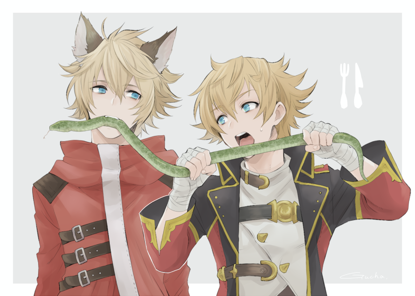 10s 2boys animal animal_ears bandages blonde_hair blue_background blue_eyes coat erune feather_(granblue_fantasy) fork granblue_fantasy gucha_(netsu) knife looking_at_another male_focus mouth_hold multiple_boys open_clothes open_coat open_mouth simple_background snake stan_(granblue_fantasy) upper_body