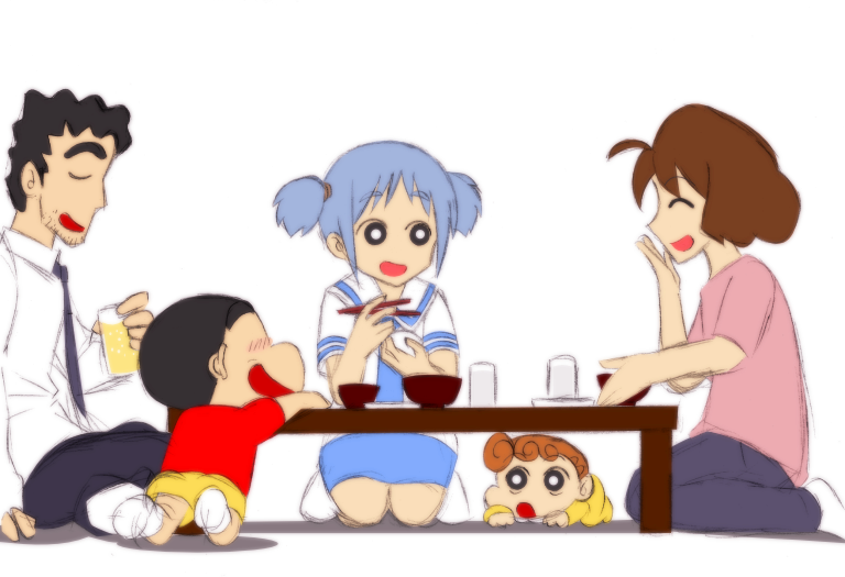 2boys 3girls alcohol baby bad_id bad_pixiv_id beer black_eyes black_hair black_pants blue_hair blue_pants blue_skirt bowl brown_hair chocott crayon_shin-chan crossover food glass happy multiple_boys multiple_girls naganohara_mio necktie nichijou nohara_himawari nohara_hiroshi nohara_misae nohara_shinnosuke orange_hair pants pink_shirt red_shirt rice_bowl school_uniform shirt shorts skirt tokisadame_school_uniform yellow_shorts