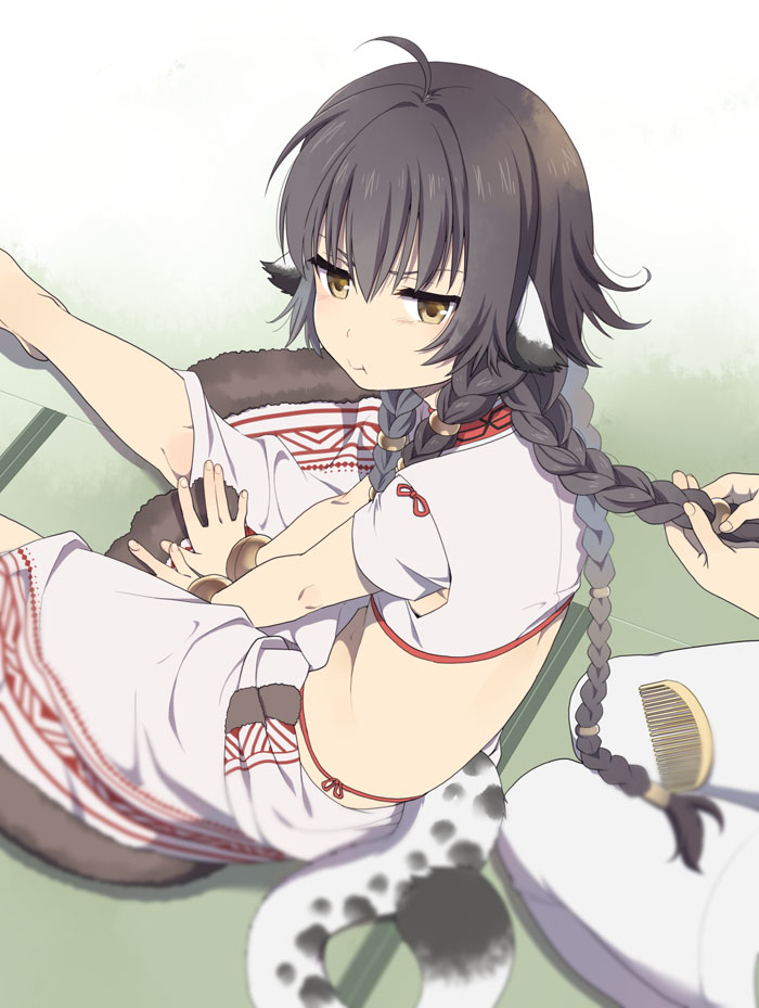 10s 1girl ahoge animal_ears anju_(utawarerumono) bangle black_hair blurry bracelet braid braiding_hair comb cowboy_shot depth_of_field from_side hair_between_eyes hairdressing japanese_clothes jewelry jitome leopard_ears leopard_tail low_twintails mattaku_mousuke midriff multiple_braids pout quad_braids seiza short_hair_with_long_locks short_sleeves side_braid sitting solo_focus tail tatami twintails utawarerumono utawarerumono:_futari_no_hakuoro utawarerumono:_itsuwari_no_kamen yellow_eyes