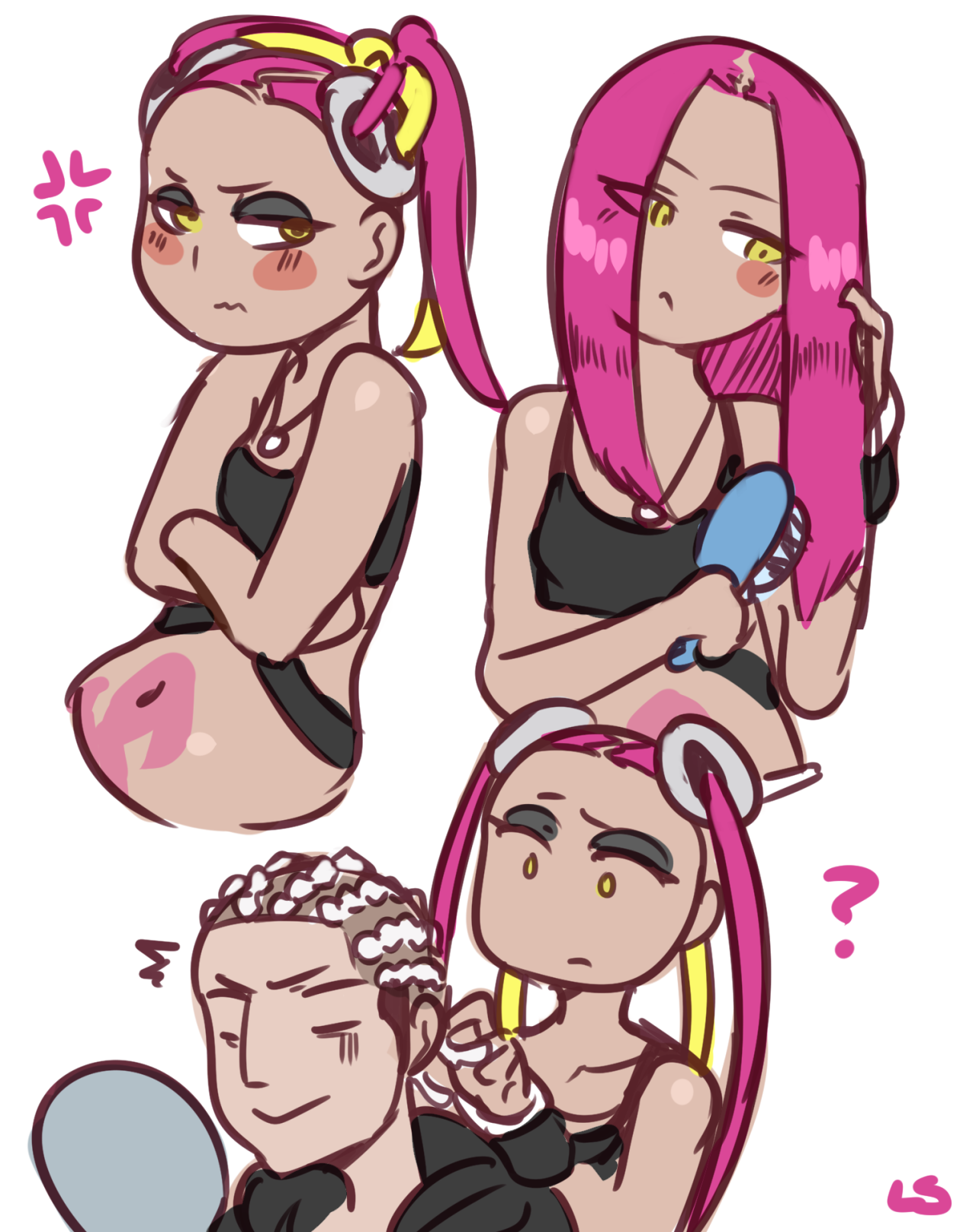 1boy 1girl alternate_hairstyle eyeshadow flat_color guzma_(pokemon) hair_down highres makeup makeup_removed multicolored_hair navel nintendo plumeria_(pokemon) pokemon pokemon_sun_and_moon reference_sheet team_skull upper_body white_background
