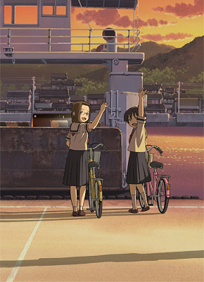 00s 2girls bicycle brown_hair dusk female_focus hitotsubashi_yurie kamichu! lowres multiple_girls naruko_hanaharu school_uniform serafuku shijou_mitsue waving