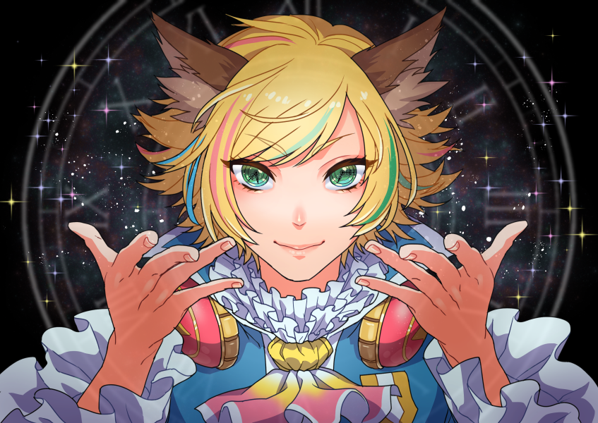 10s 1boy animal_ears ascot bad_id bad_pixiv_id bishounen black_background blonde_hair blue_eyes headphones male_focus misaka_niumu multicolored_hair multiple_boys short_hair show_by_rock!! shu_zo_(show_by_rock!!) smile solo star_(symbol) streaked_hair