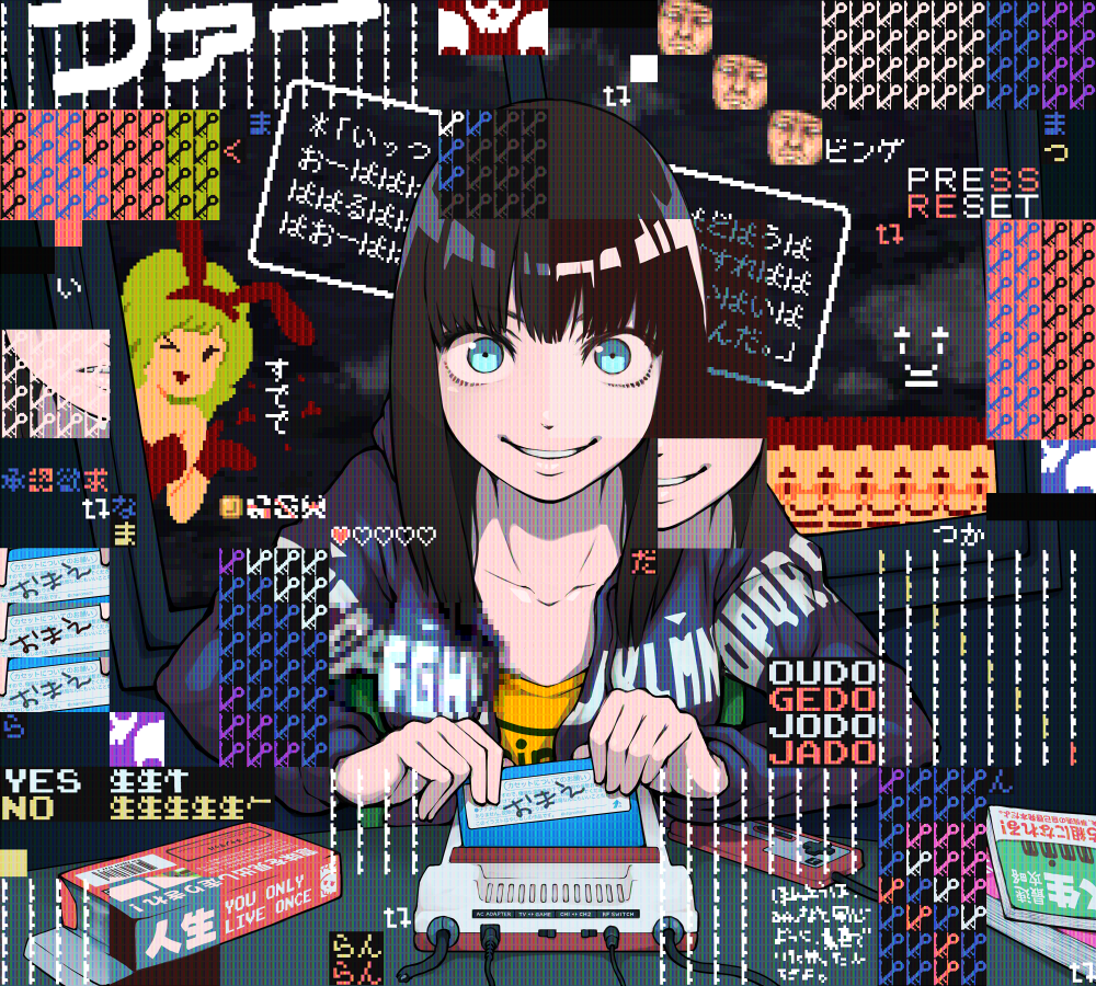 >_o 1girl animal_ears blue_eyes box brown_hair rabbit_ears cartridge clothes_writing coin collarbone commentary_request copyright_request english_text evil_smile fake_animal_ears famicom female_focus game_console glitch green_hair heart hood hoodie key lipstick long_hair long_sleeves looking_at_viewer makeup nintendo one_eye_closed original parted_lips red_lips scanlines skull smile solo super_famicom upper_body yajirushi_(chanoma)