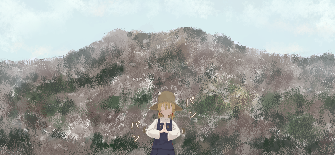1girl bare_tree blonde_hair blush_stickers closed_eyes day female_focus hair_ribbon hat hill long_sleeves moriya_suwako mountain outdoors own_hands_together praying ribbon skirt skirt_set sky solo touhou tree turtleneck vest yukima_(yushika)